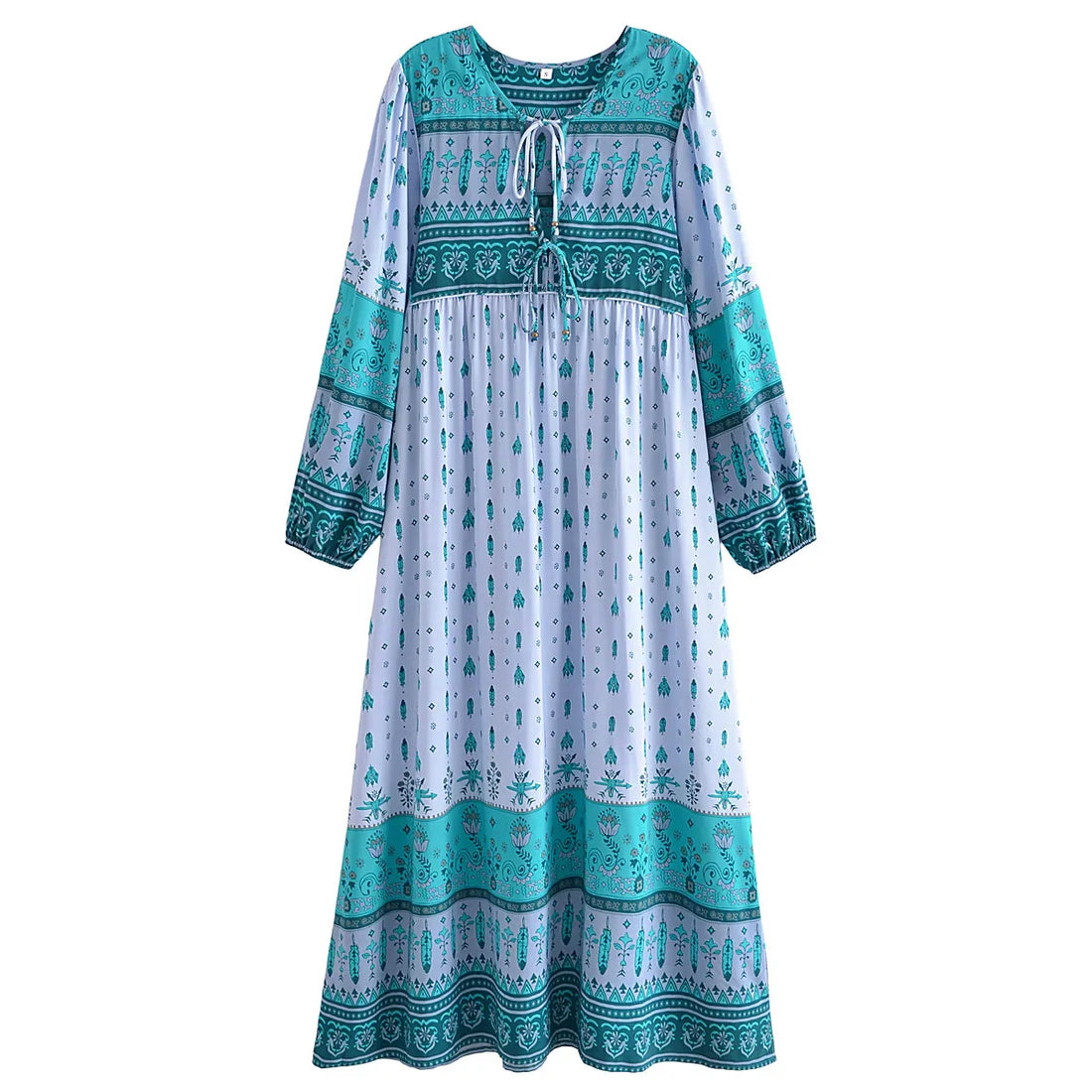 Gypsy Feather Boho Floral Print Long Sleeve Maxi Dress