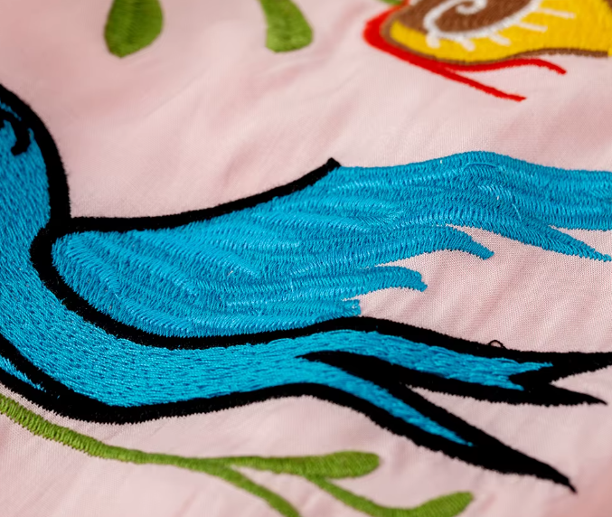 ? Intricate bird, flower, and heart embroidery adds a romantic touch